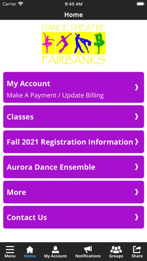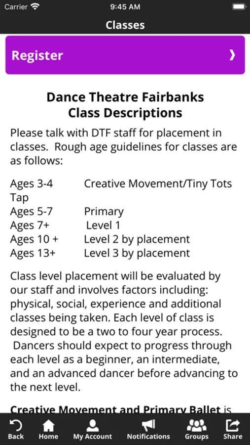 The Dance Theatre Fairbanks app allows you to manage your account with ease, register for classes, parties, and special events. You'll also receive important notifications about class changes, closings, registration openings, special announcements, and upcoming events.