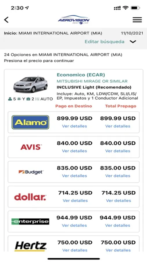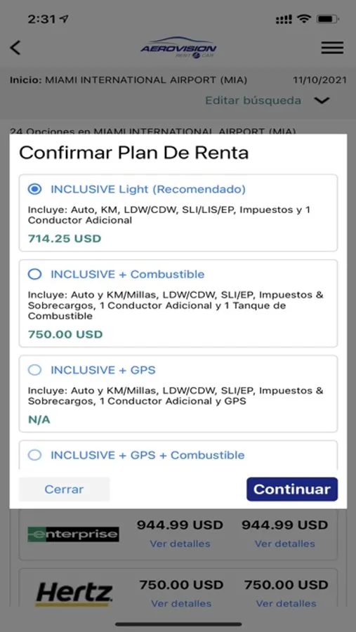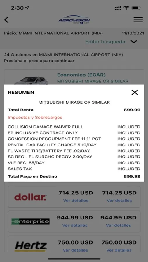 La búsqueda inicial se procesa y se muestra con el plan de rentas mas popular del momento. En la descripción del auto, se explican los productos incluidos en la tarifa como: Auto y millas, protección de colisión y robo (LDW/CDW), seguro de responsabilidad civil suplementaria (SLI), Impuestos y Recargos Locales, etc. Estas inclusividades varían de acuerdo con el plan de renta solicitado. Este plan se puede actualizar haciendo clic en la opción “Editar Búsqueda”.