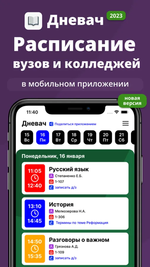 Смотри расписание занятий своего вуза, колледжа или техникума в быстром, удобном и красивом формате, а также записывай домашние задания в мобильном приложении Дневач!