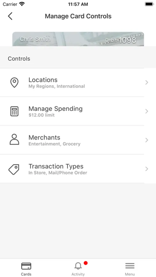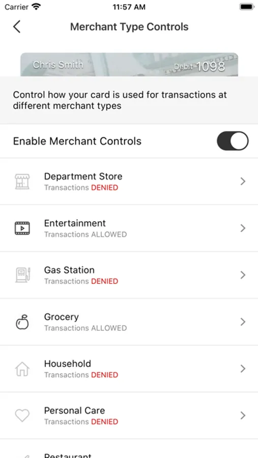 Spending limits can be established to allow transactions up to a certain dollar value and decline transactions when amounts exceed your defined thresholds. Transactions can be monitored and managed for specific merchant categories such as gas stations, department stores, restaurants entertainment, travel, and groceries. Your transactions can also be monitored for specific transaction types such as in-store purchases, e-commerce transactions, mail/phone orders and ATM