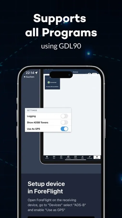 Flight GPS has a super easy setup. Simply connect both of your devices to the same Wi-Fi or hotspot, start Flight GPS, open Foreflight, watch them automatically sync up, and you are ready for takeoff!