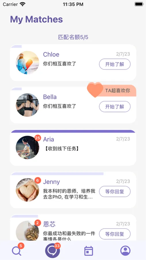 2. 深度了解,灵魂发问:如果双方对profile互点了小心心,将进入互动环节。在这个环节中,双方都要向对方提出3个问题,并且回答对方的问题。