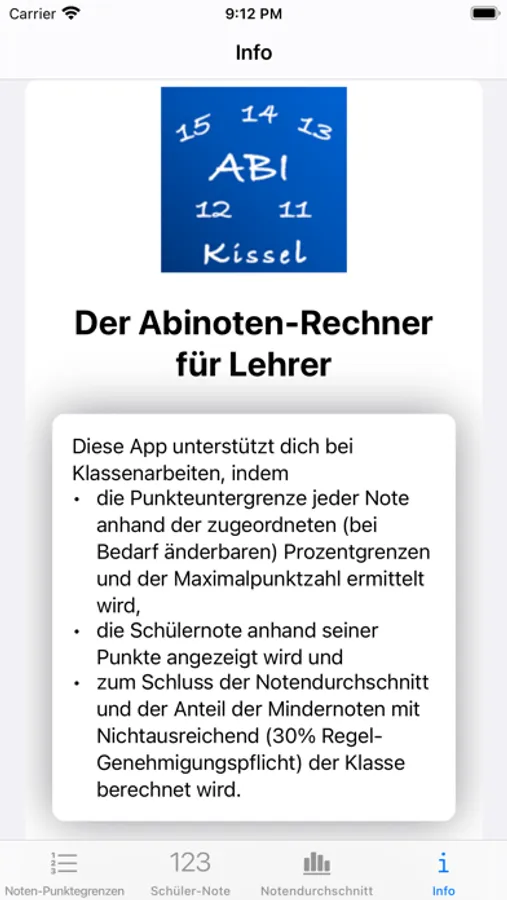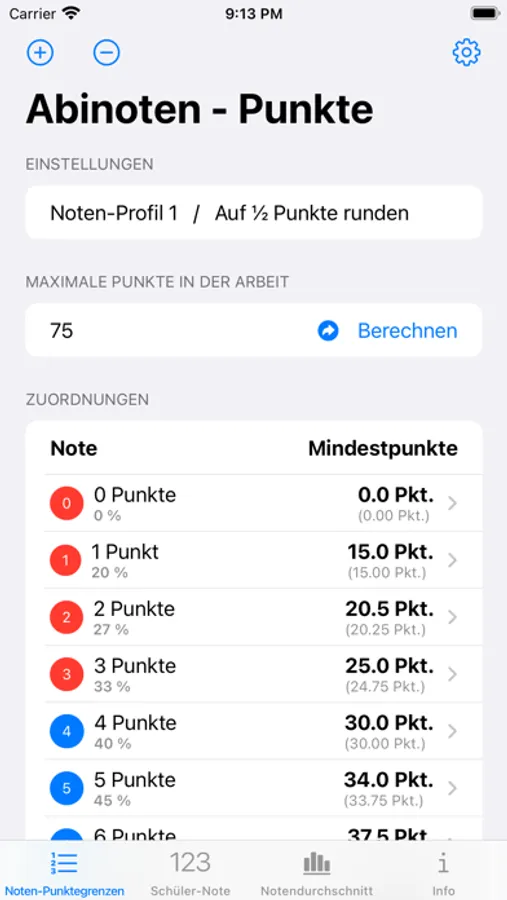 1. die Punkteuntergrenze jeder Note (0-15) anhand der zugeordneten (bei Bedarf änderbaren) Prozentgrenzen und der Maximalpunktzahl ermittelt wird,