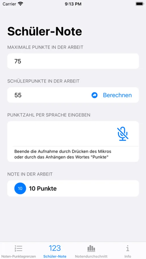 Spracheingabe: Die Eingabe der Punkte zur Berechnung der Schülernote kann per Tastatur oder per Spracherkennung erfolgen, so dass die Notenbestimmung noch schneller geht.