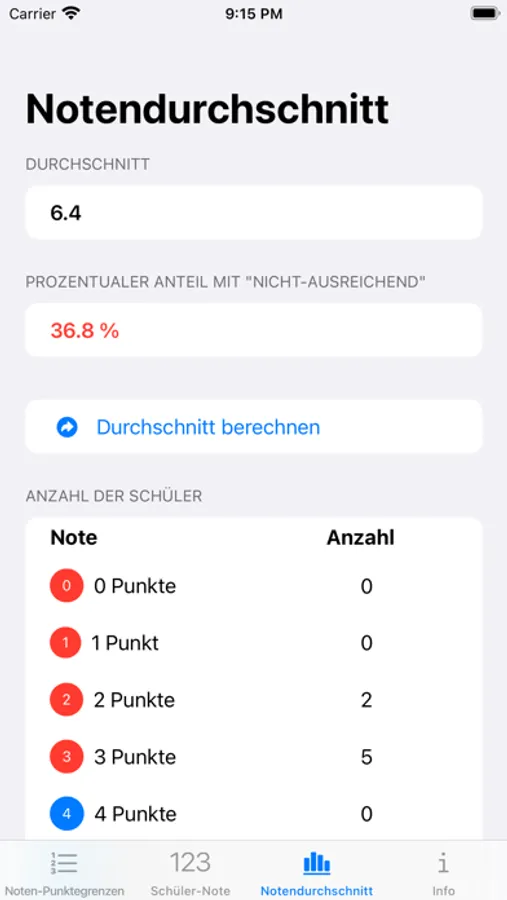 3. zum Schluss der Notendurchschnitt und der Anteil der Mindernoten mit Nichtausreichend (30% Regel-Genehmigungspflicht) der Klasse berechnet wird.