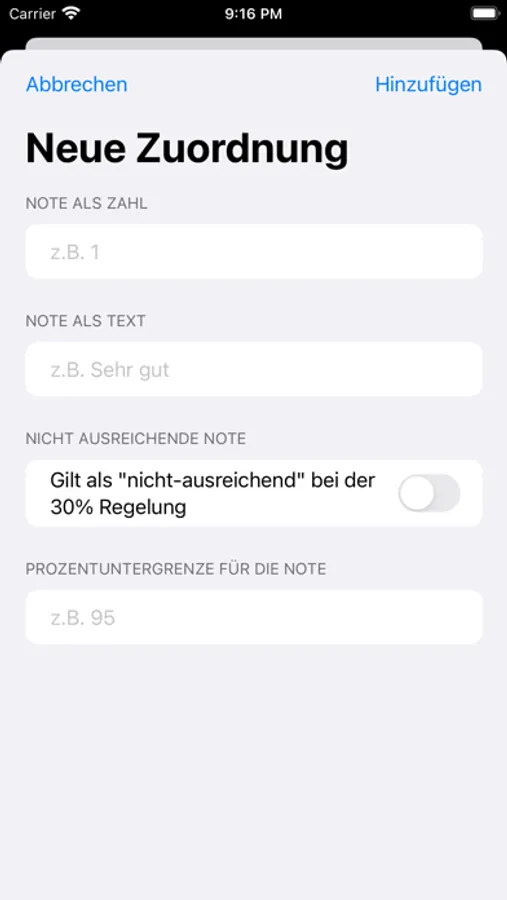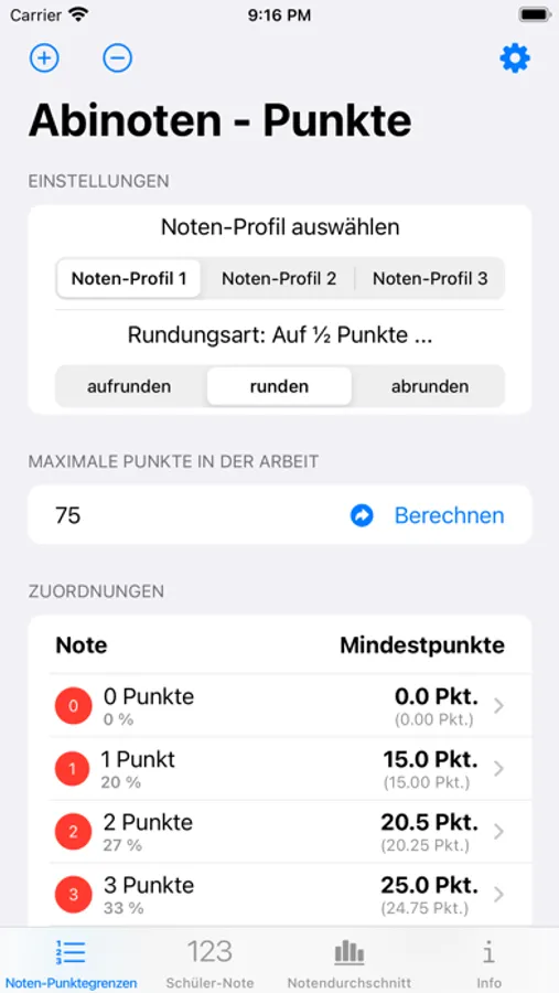 Zusätzlich kannst du zwischen verschiedenen Notenprofilen wechseln, falls sich die Bewertungen (Prozentgrenzen) ggf. unterscheiden.