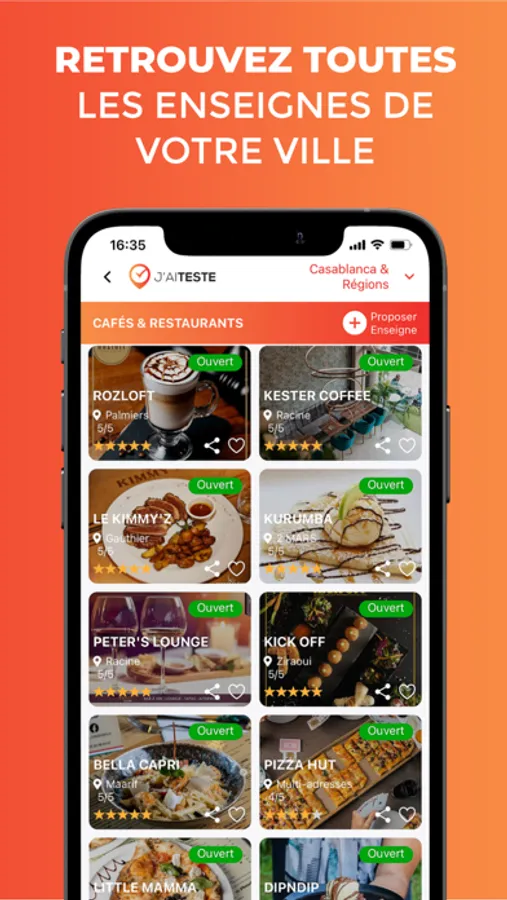 J’AI TESTÉ est la seule et unique application dont vous aurez vraiment besoin pour prendre les bonnes décisions de consommation du quotidien ! Qu'il s'agisse d'un déjeuner rapide à proximité, d'une pause détente au spa ou d'une bonne école pour votre enfant, J’AI TESTÉ est votre fidèle compagnon qui vous aidera à découvrir ou redécouvrir les meilleurs endroits au Maroc, grâce, entre autres, aux avis honnêtes de notre chère communauté.
