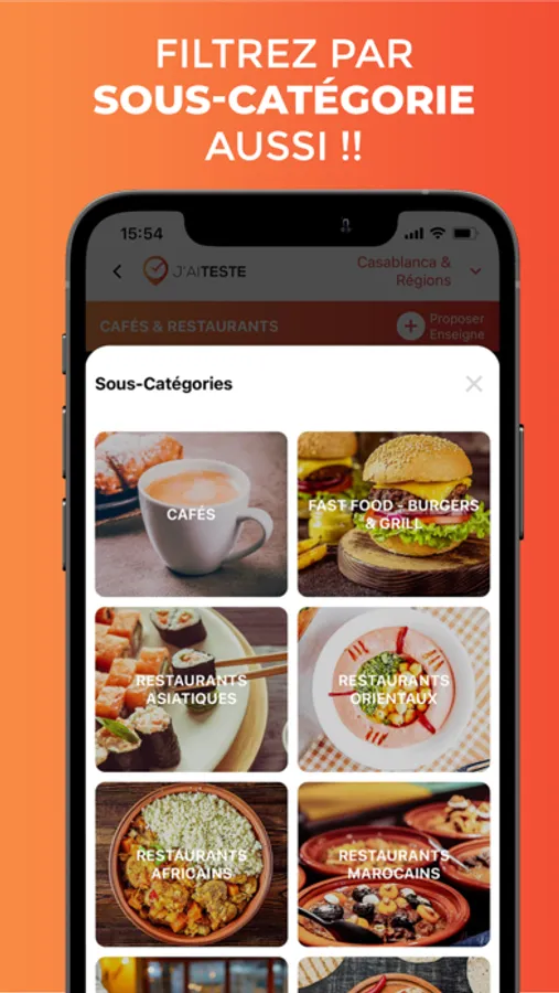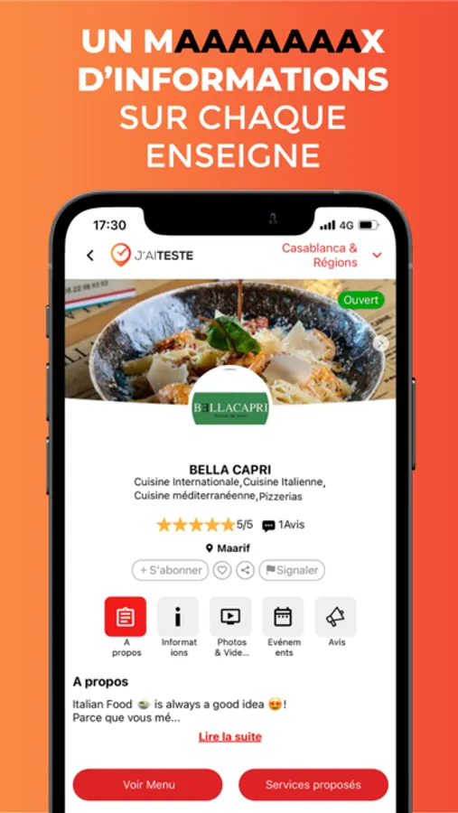 J’AI TESTÉ est une application qui vous permet de retrouver tout ce que vous voulez en un seul clic, tout en ayant le max d’informations dans votre ville de résidence ou lors de vos déplacements au Maroc : un restaurant, un coiffeur, un hôtel, un garage, une crèche, une voiture à louer, un médecin… Tout y est dans un design très simple et intuitif. Profitez de remises exceptionnelles allant jusqu’à -70% grâce aux deals de nos partenaires. Soyez au courant de tous les évènements culturels qui se déroulent dans votre ville de résidence ou de destination.