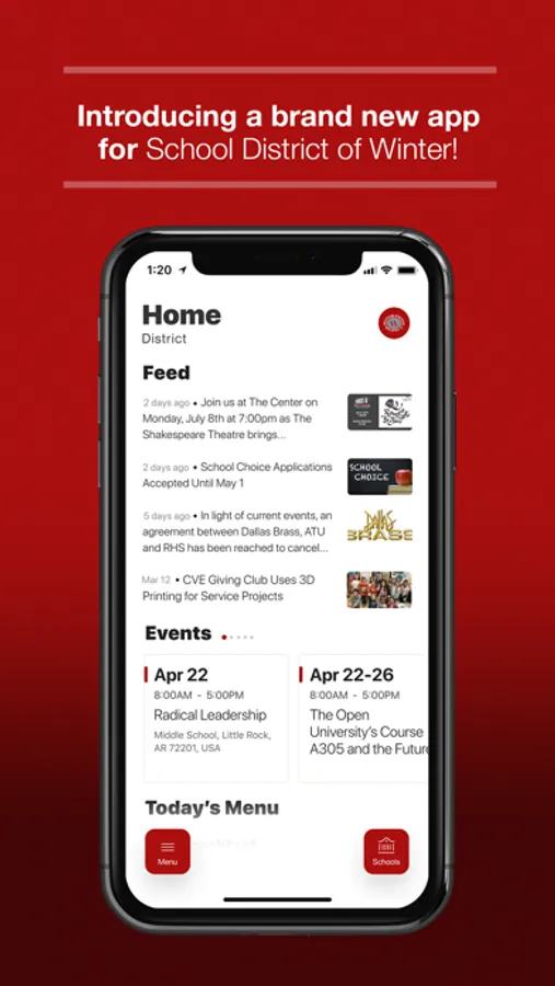 The event section shows a list of events throughout the district. Users can add an event to your calendar to share the event with friends and family with one tap.