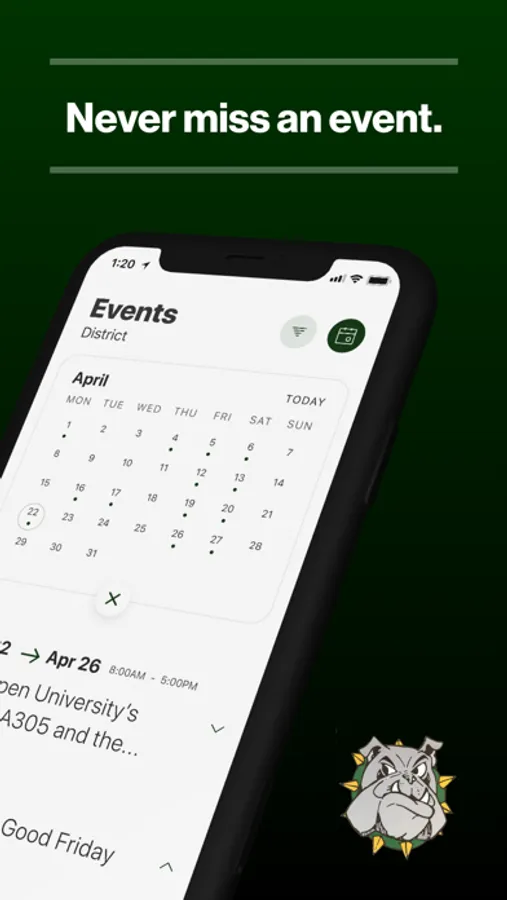 The event section shows a list of events throughout the district. Users can add an event to their calendar to share the event with friends and family with one tap.