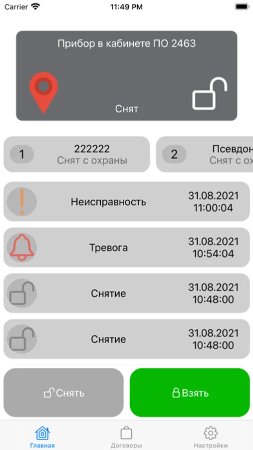 1) Взят на охрану/снят с охраны - соответствующие замки;