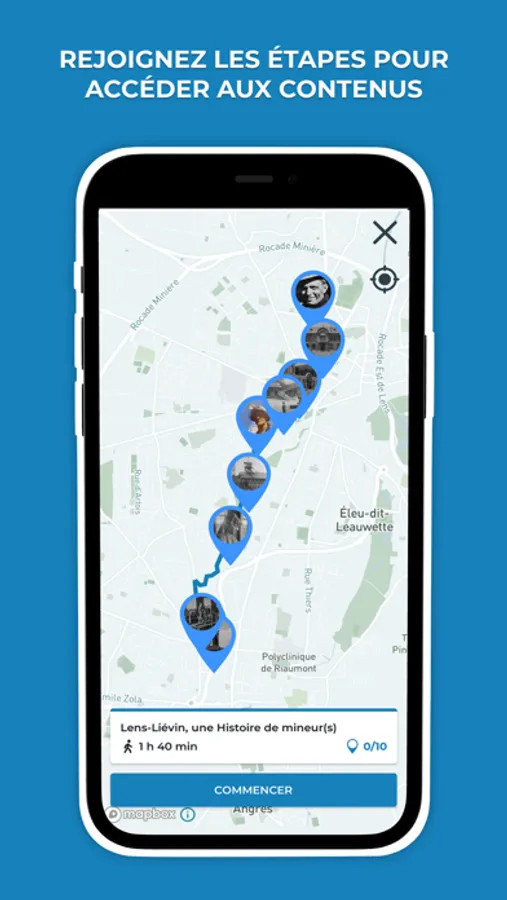Connectez-vous, l’appli vous géolocalise et vous propose un panel de parcours disponibles autour de vous à faire à pied ou à vélo, seul ou en famille. Ces parcours aux thèmes histoire et nature vous présentent de façon ludique la richesse de l’histoire de votre ville et des écosystèmes des espaces naturels autour de vous.