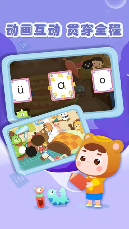 丰富的拼音体系,涵盖单韵母、声母 、复韵母等内容的拼音学习,一个拼音多处交互,玩、认、读、拼、练 、单元挑战六大环节,学习过程层层提升,每天都有新进步。