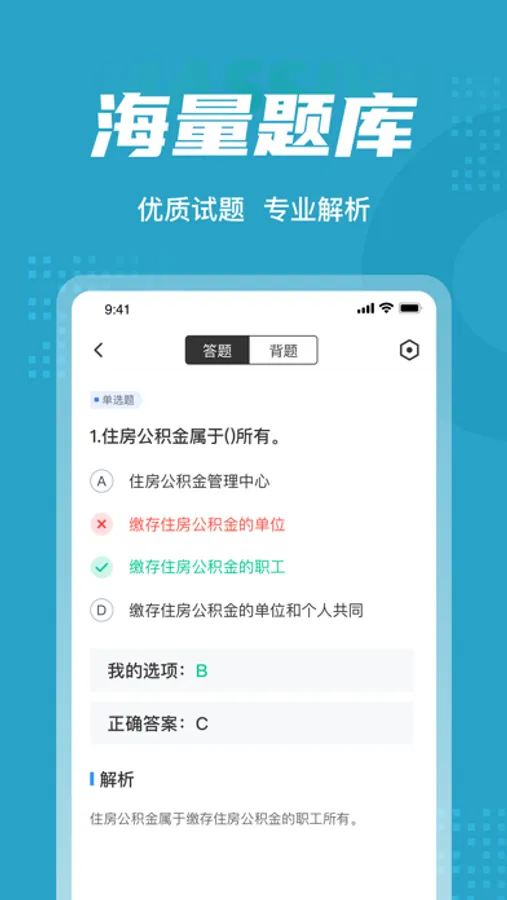 住房公积金专办员题库内含考点练习,全国通用卷以及地区卷模拟练习,以及按照固定考试比重的随机式的抽题的真题考场,成绩单实时记录考试数据,一点一滴的反馈考生近期学习状态以及自我正确率的提升,大大的给予考生通过考试的信心。