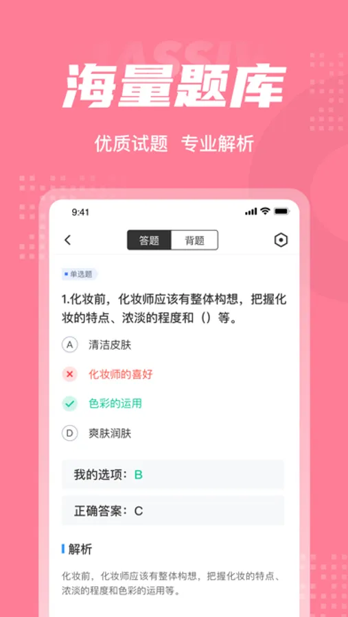 化妆师APP新增模拟考试功能,化妆师可按照自我练习的考点选择相对应的模拟试卷,也可选择搭配好的模拟整卷考试。