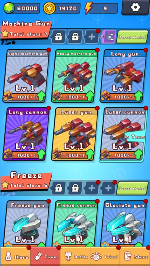 - Turret Types: Rapid gun, Freeze gun, Poison gun, etc;