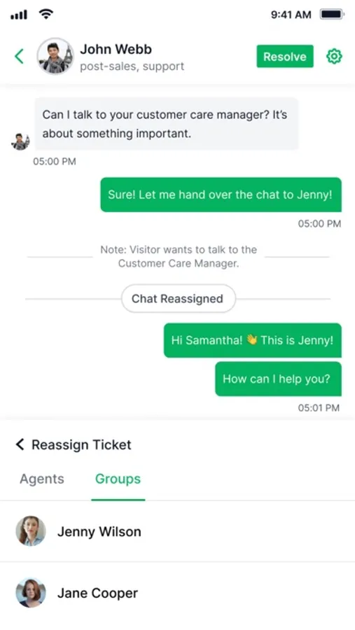 Assign, reassign or resolve tickets from your phone in real-time, leave private notes, and save customer attributes to make team collaboration easy-peasy.