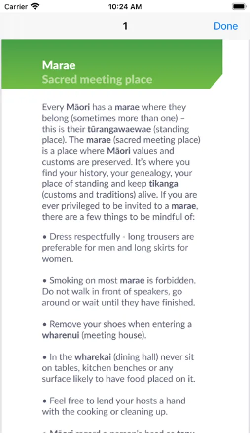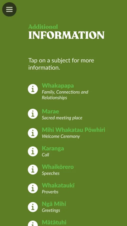 Interactive features within the app include pronunciation of Māori words, maps with Māori names and iwi groups, values (Ngā Mātāpono), and principles, mihimihi/pepeha (introductions), ngā mihi (greetings), poroporoaki (farewells), whakataukī (proverbs), and waiata (songs).