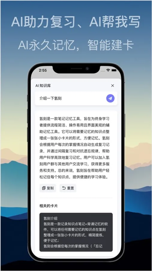 氢刻集成AI能力,AI会学习卡片内容,形成专属知识库,永久的AI记忆,智能记忆检索,自动组织智能化回答。