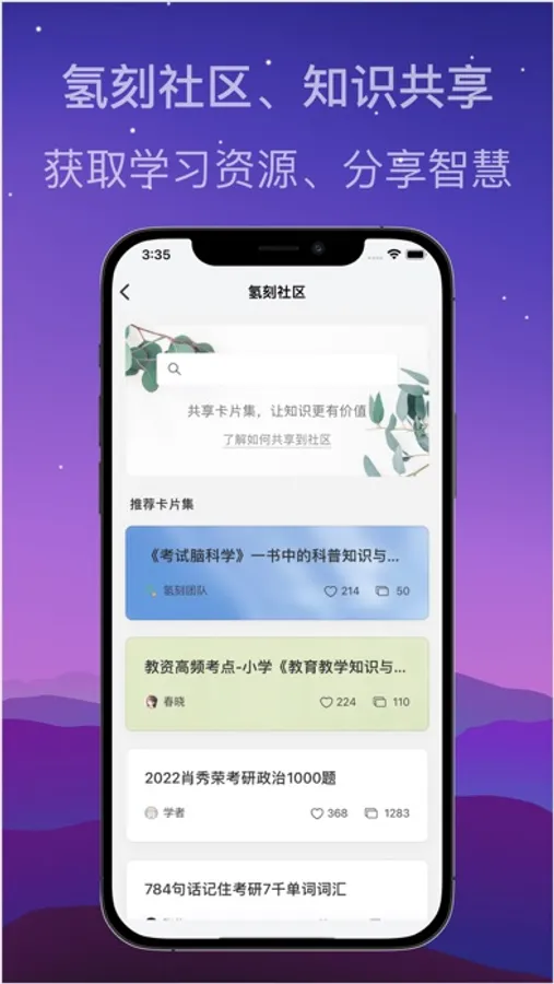 氢刻鼓励分享,不仅可以学习自己的卡片集,也同样可以对其他人创建的卡片集进行学习。
