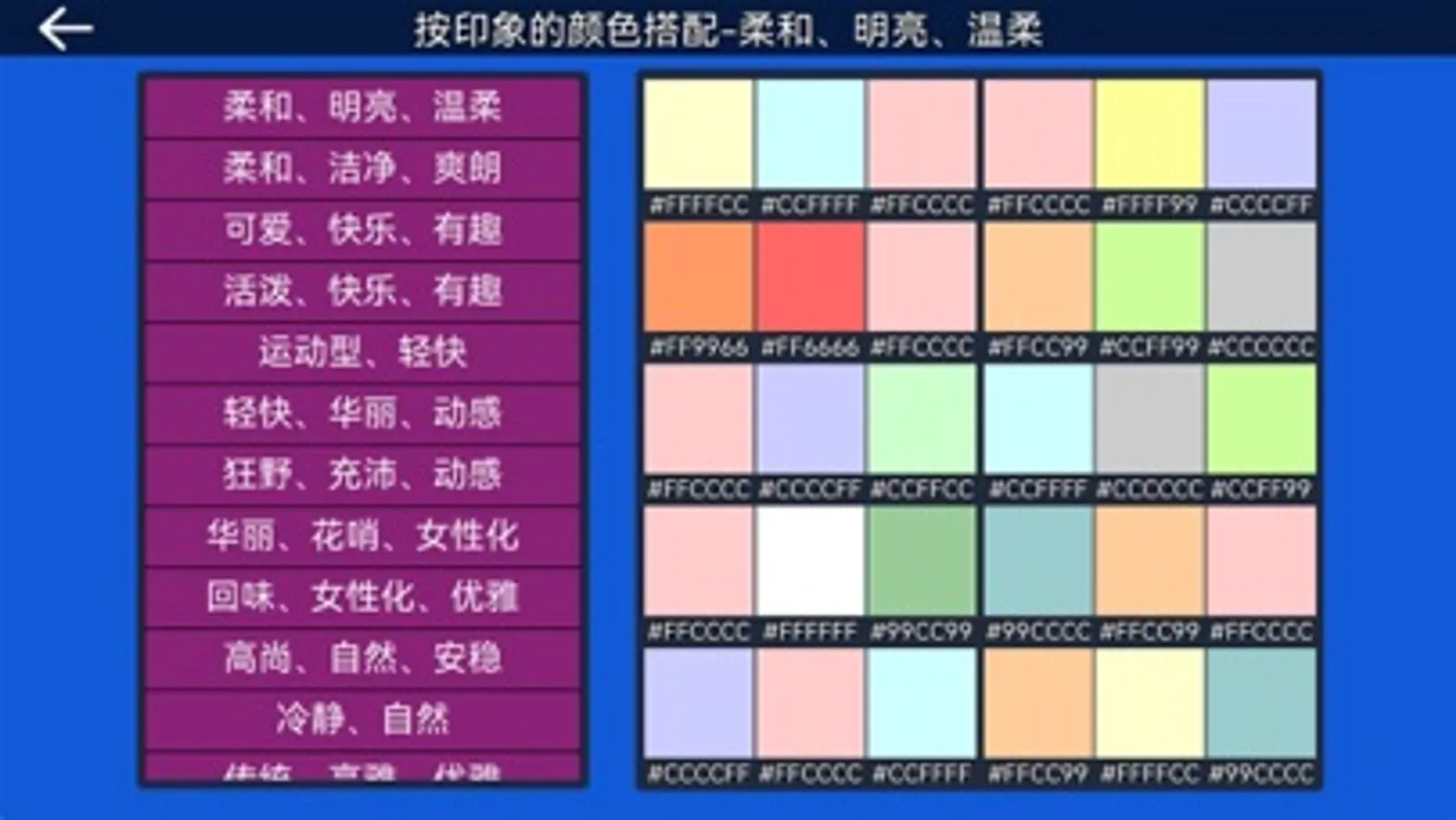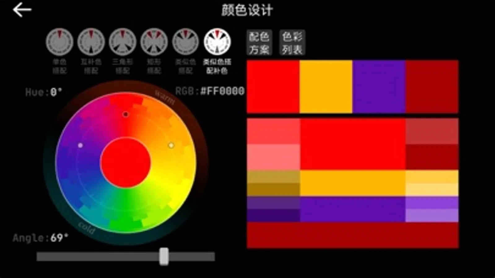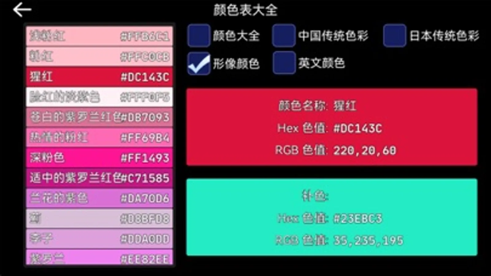 颜色大全是一款关于配色的小工具。包含了按色相配色方案,按印象配色方案。包含了用主题与关键字查询的工具,可查找建议的配色。内置颜色表大全,提供了中国传统色彩表,日本传统色彩表,中文名颜色表,英文名颜色表,颜色大全表等,可快速找到想要的颜色。颜色设计模块,是根据配色理论复刻出来的,可轻松进行颜色搭配与设计。
