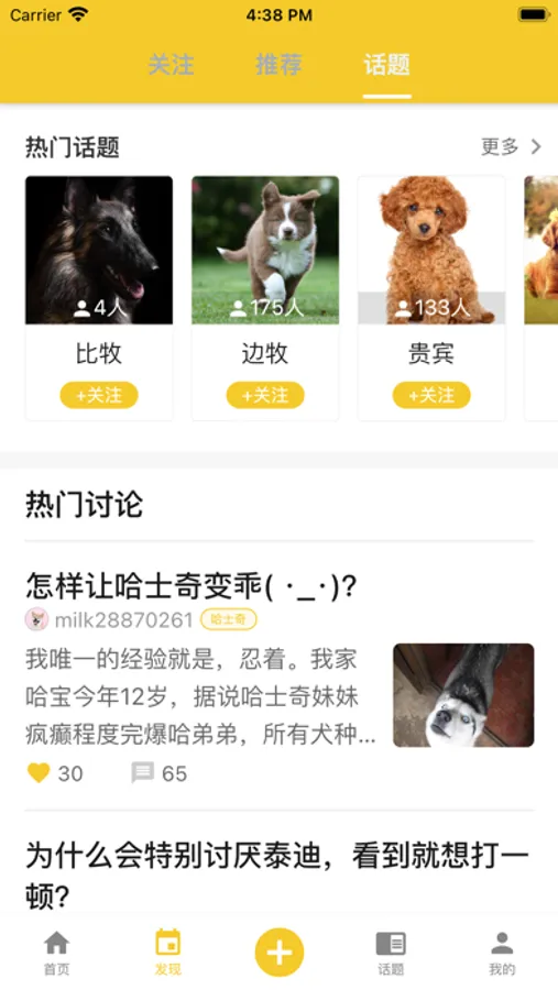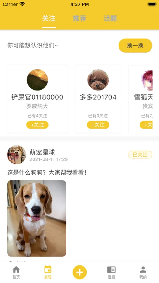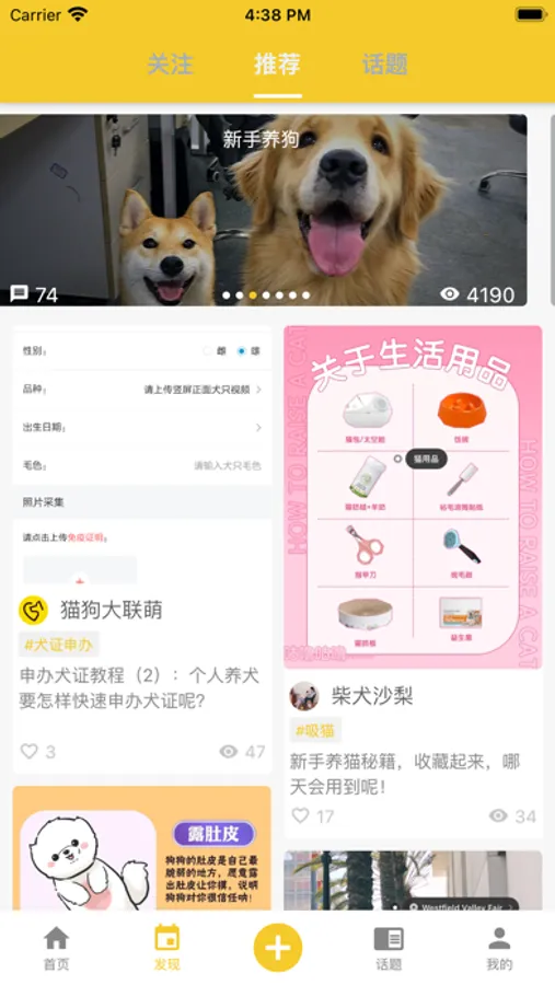 推荐自己关注的萌宠博主,看到新鲜的人和动物,对自己喜欢的动物和博主可以进行点和关注。