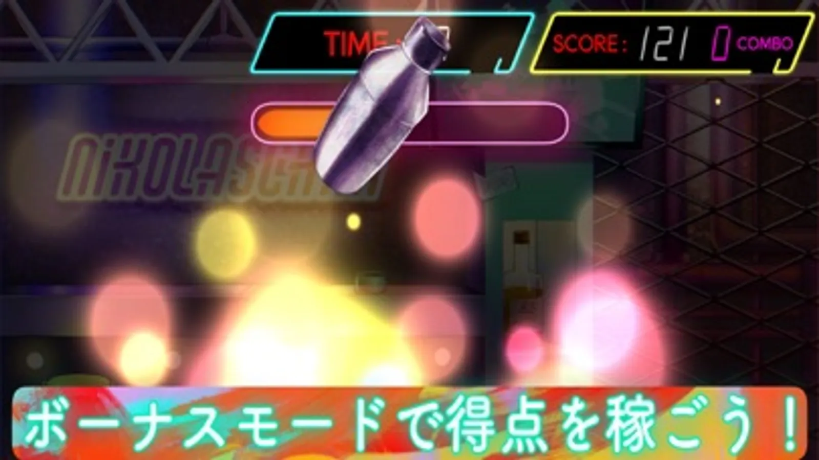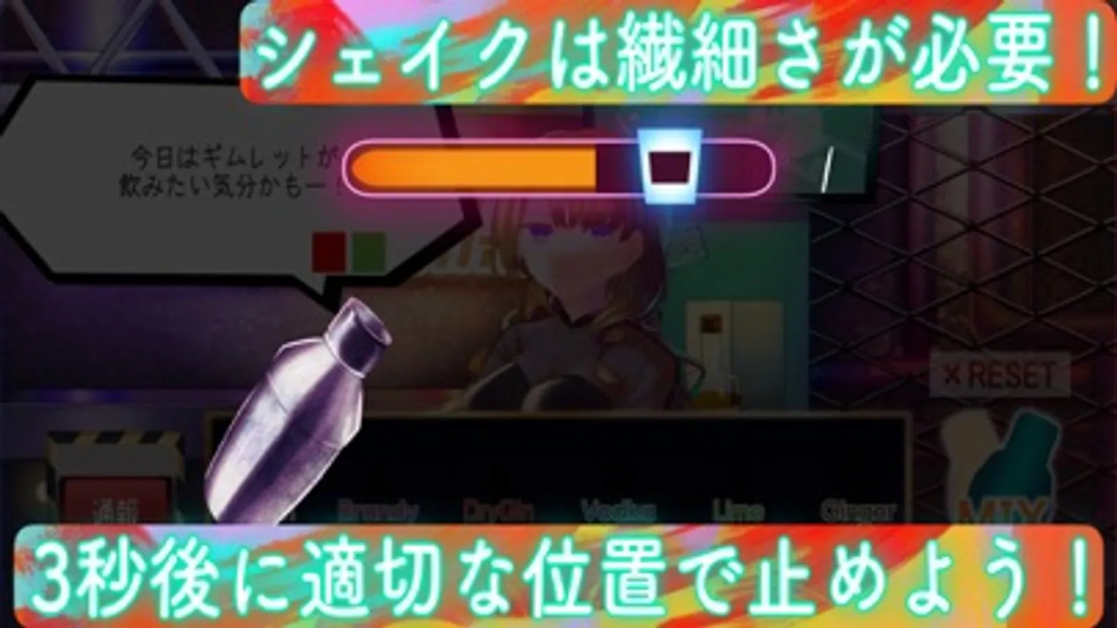・次はシェイク。ミックスが成功するとカクテルシェイカーが表示される。画面を縦横無尽にスワイプしてくれ!スワイプするとシェイクゲージが溜まるから、3秒後に適切な位置で止めよう!