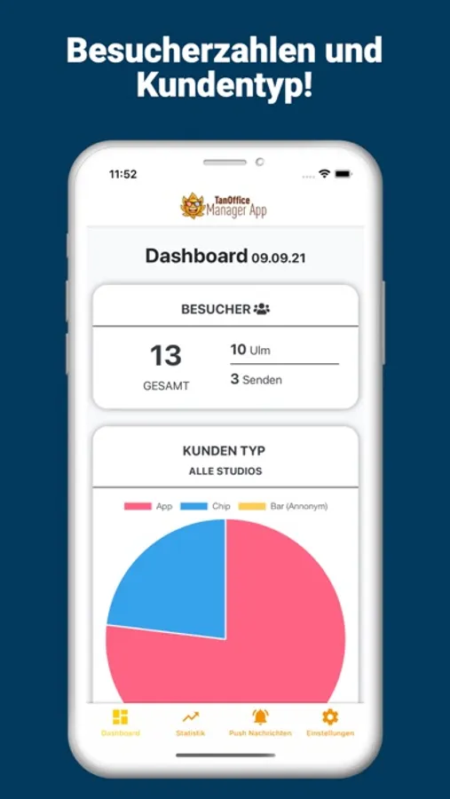 Mit dieser spezialisierten App, besitzen ausschließlich Sonnenstudio-Betreiber/-innen die Möglichkeit, immer und überall Statistiken über Besucherzahlen, App-Nutzungen und Einstellungen ihrer Sonnenstudios, aufzurufen.