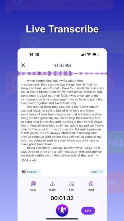 Transcribe:Voice to Text supports real-time recording to text, as well as external audio import and transcription, and supports voice to text in 100+ languages. Dictate and transcribe your voice memos into text instantly with real-time live transcription or record your meetings and have your transcripts emailed to your inbox automatically.