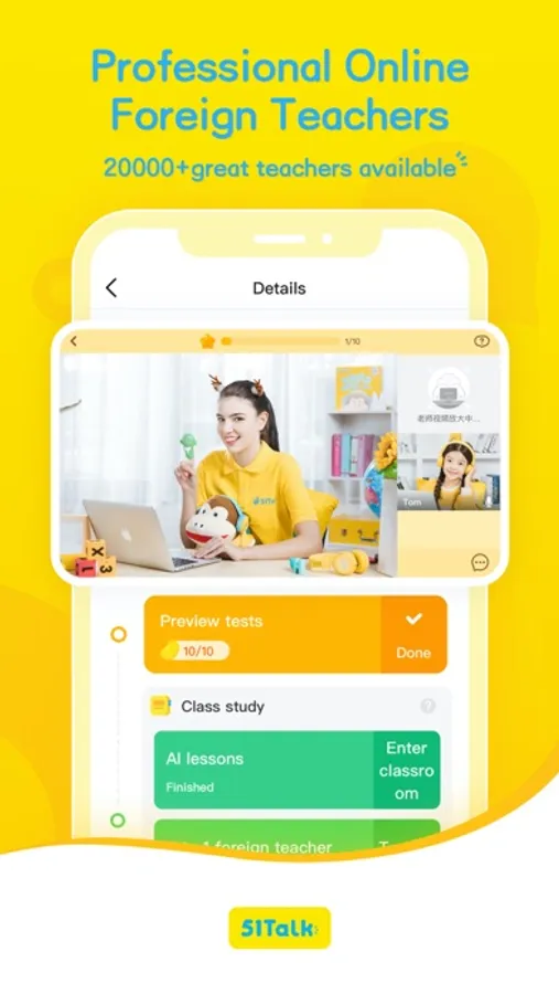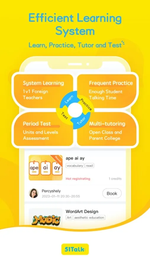 [Anytime, Anywhere] Open 51Talk app and schedule your lesson with only two steps. Over 20,000 tutors and 36 time slots per day for you to choose! Take lessons with your phone, tablet or computer and learn wherever and whenever you like.
