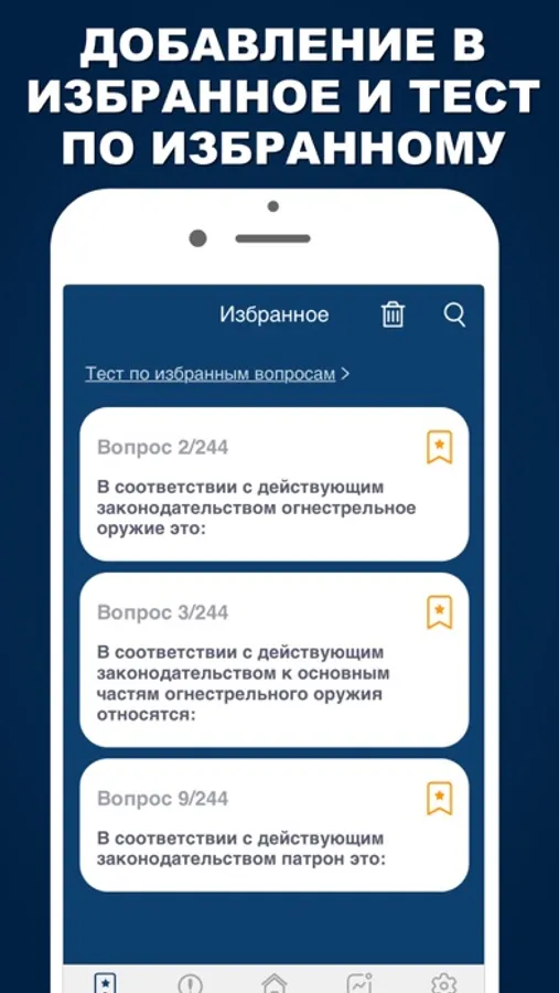 ► Избранное - можно добавлять вопросы в Избранное из всех трех режимов, а также из Топа ошибок.