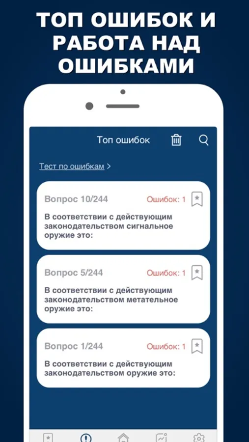 ► Работа над ошибками - тестирование по всем вопросам, в которых были допущены ошибки.
