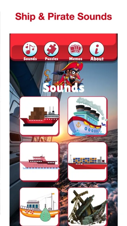 Designed for kids aged 6 and under. The exciting adventures for kids , simple enough to be fun, but educational enough for them to learn about the life of a pirate. This application is perfect for little kids. - Touch the screen to activate Pirate ship, Cruise, Speedboat, or pirate king noises and then match it to the respective pirate ship with a picture.