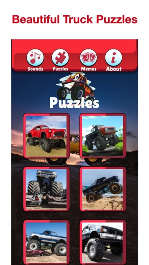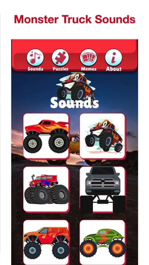 But wait, there's more! The Monster Truck Game For Kids Free includes a delightful selection of monster truck games for kids such as puzzles, matching games with memory cards, and funny monster truck sounds that will have your child laughing.