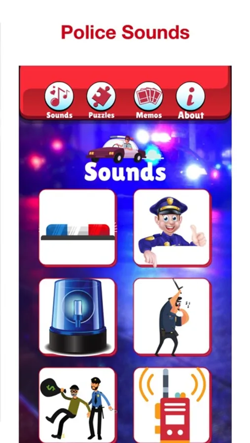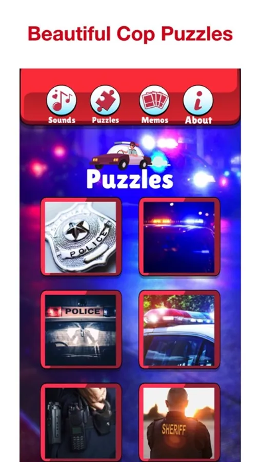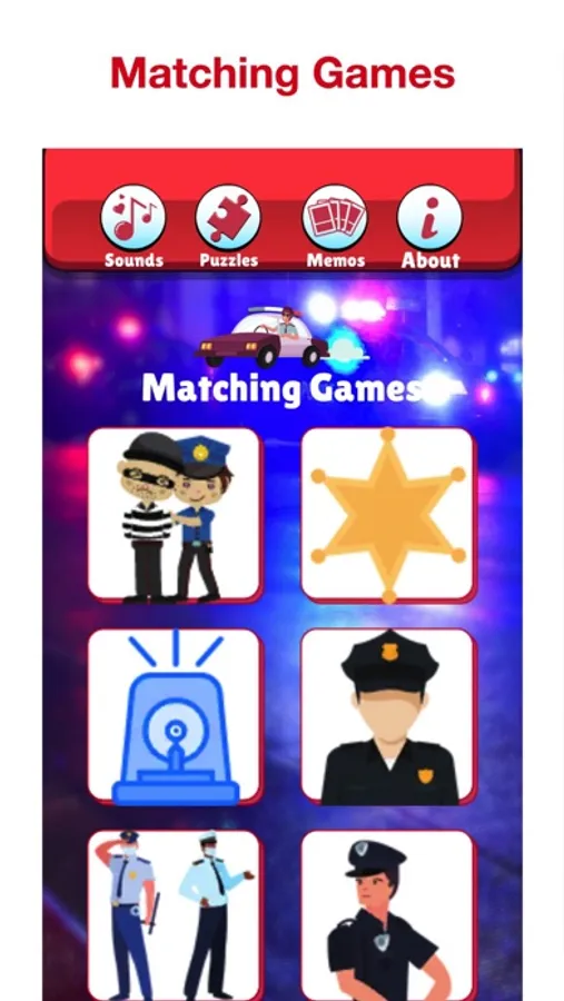 But wait, there's more! The Police Cars for Kids free includes a delightful selection of police games for kids such as puzzles, matching games with memory cards, and funny police siren sounds that will have your child laughing.