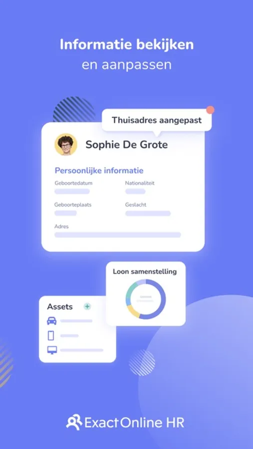 Je eigen personeelsdossier raadplegen? De app toont je persoonlijke gegevens, je activa, de samenstelling van je salarispakket en ga zo maar door. Bovendien kan je ook gemakkelijk zelf aanpassingen maken.