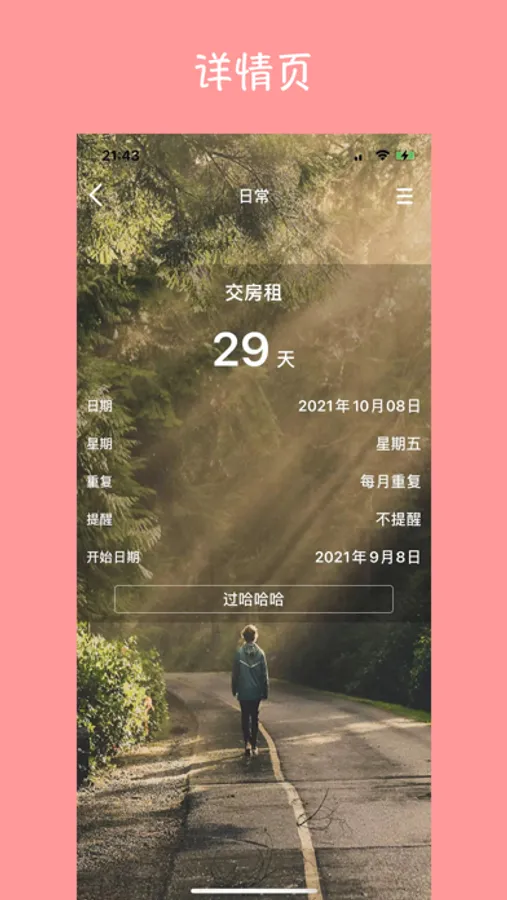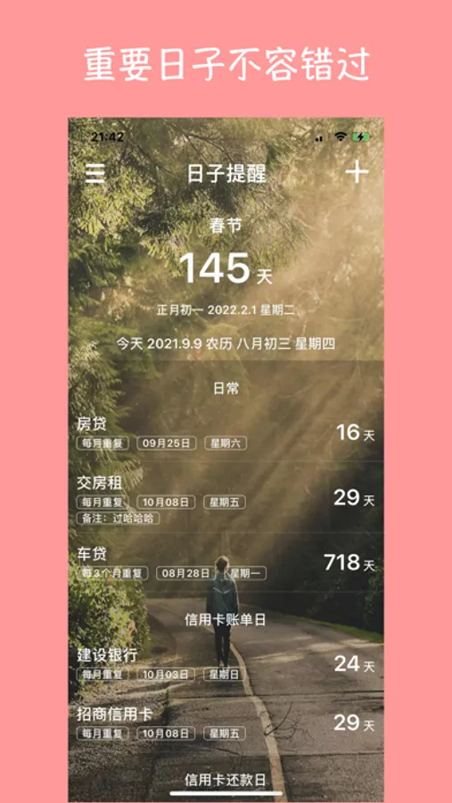 「日子提醒」是一款以事件为中心的日期提醒的生活工具,使用简单无其他复杂的功能,让您不再错过任何一个重要的日子。