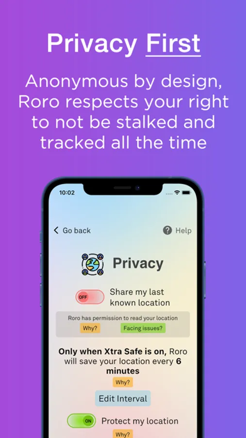 Roro encrypts and stores **only** your last known location, at an interval you're comfortable with. Mark yourself safe with a passcode at an interval you choose. Check-in every few minutes, if you're taking a cab, or a few hours, or even days. It's 100% your call.