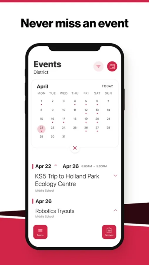 The event section shows a list of events throughout the district. Users can add an event to their calendar to share the event with friends and family with one tap.