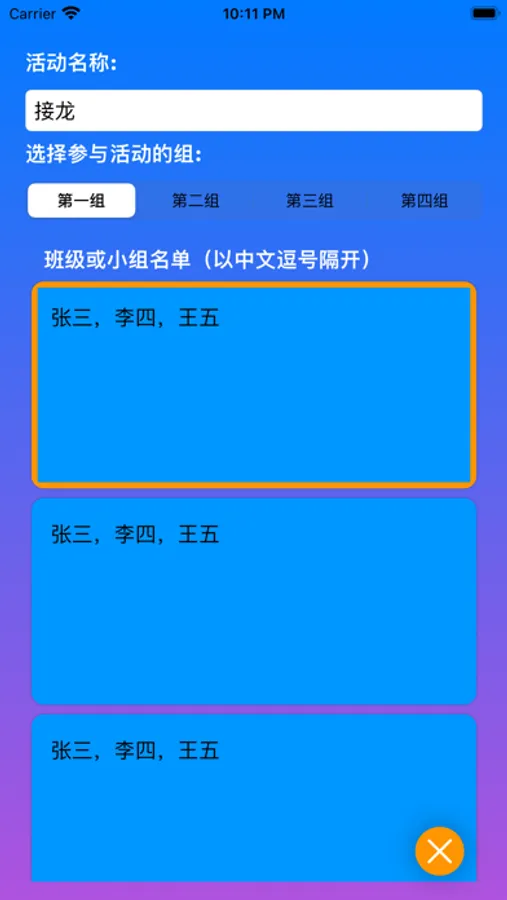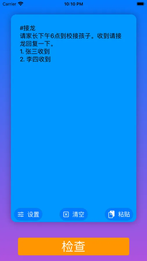 第一次使用设置方法:把您班级上的学生名字以中文逗号(,)隔开,粘贴到设置界面的数据输入框里即可。班主任需要筛查数据时,只要把微信里的接龙数据粘贴到主界面,然后按下检查键就可以了。