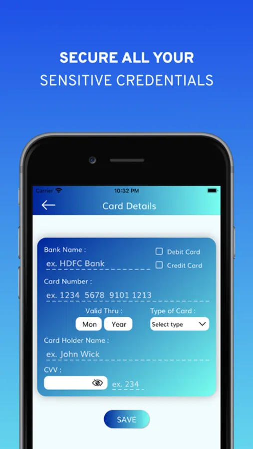 With our app, secure your sensitive credentials like website logins, bank accounts or the e-banking info, credit cards info, email accounts, IM etc.