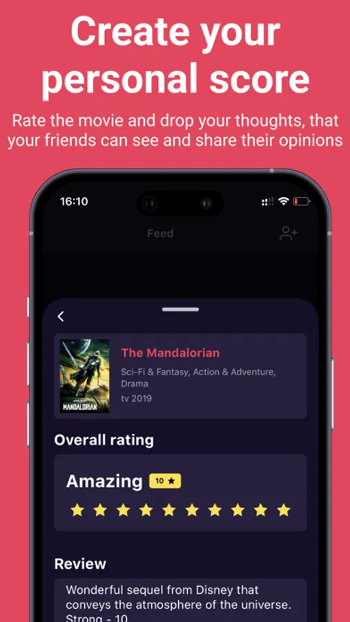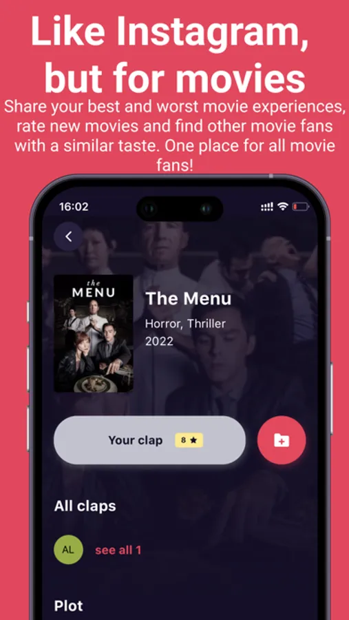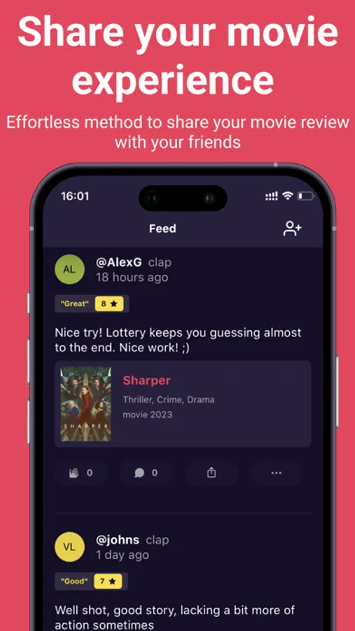 We have created a completely new place for movie enthusiasts to share their reviews and opinions with friends! Like "Instagram" but for your movie experience. With our user-friendly interface, you can easily rate movies, share your thoughts, and engage in lively discussions with your closest friends and the best movie enthusiasts directly. Our app is the perfect tool for staying connected and in the know to help you find the next movie to watch as well as other people with similar movie tastes. Download now and become a part of our vibrant community of movie lovers and discover movies to watch in seconds!