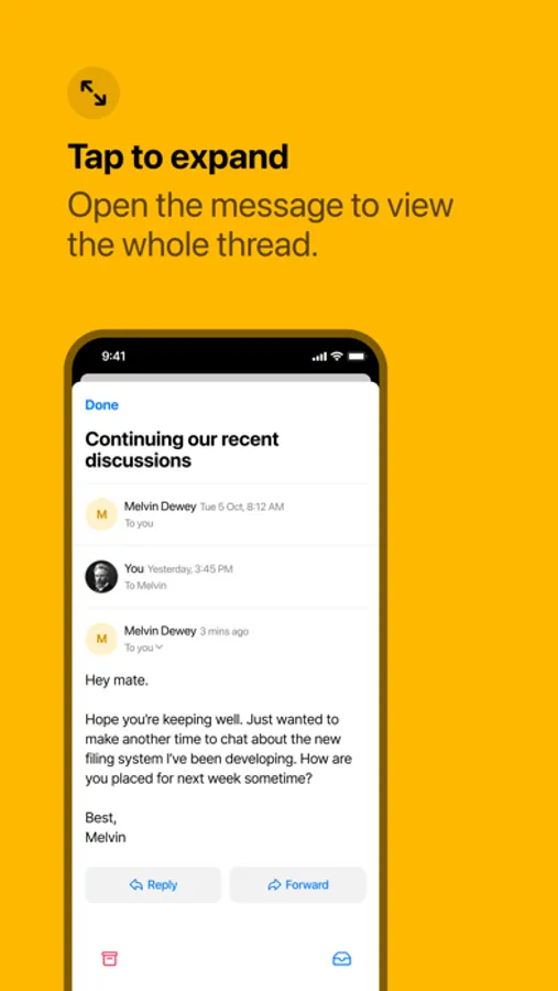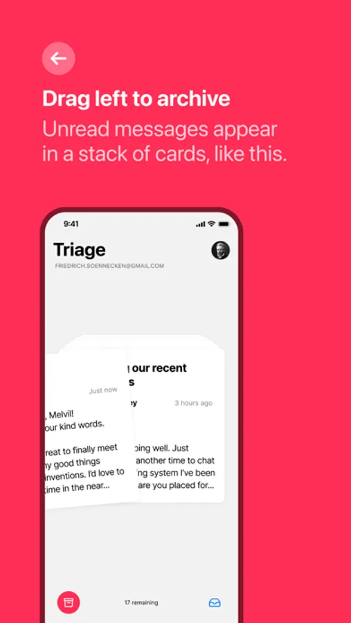 New messages appear as a familiar “stack of cards” interface. With a flick or a tap, you can quickly archive messages, keep important ones in your inbox for later, or compose a short reply.