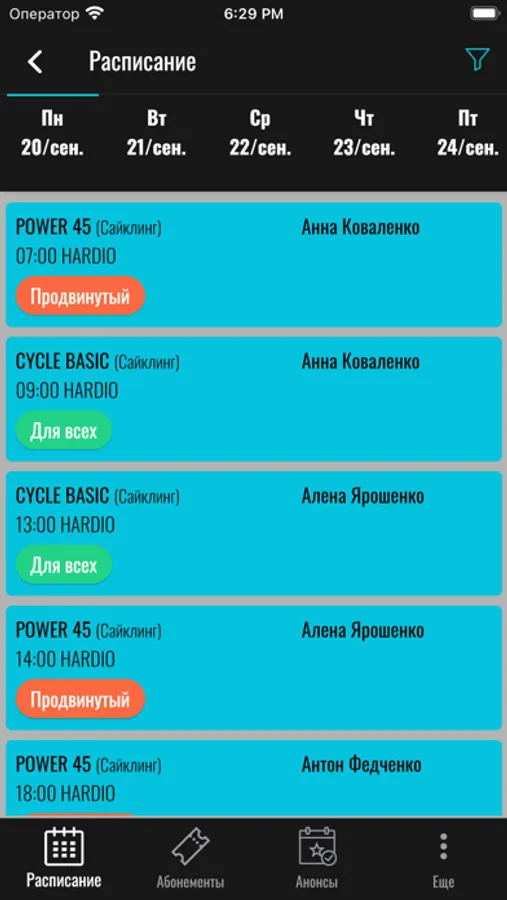 Регистрация в клубе, просмотр расписания и абонементов, запись на тренировки.