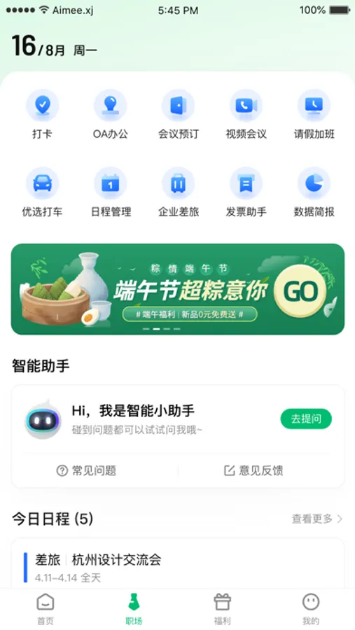 · 协同办公:可灵活配置的OA审批流程、可自助问询的AI小助手、免去报销烦恼的差旅管理、软硬件一体的会议室预订、可发积分的问卷工具、打通Outlook的日程管理,让工作效率high起来。