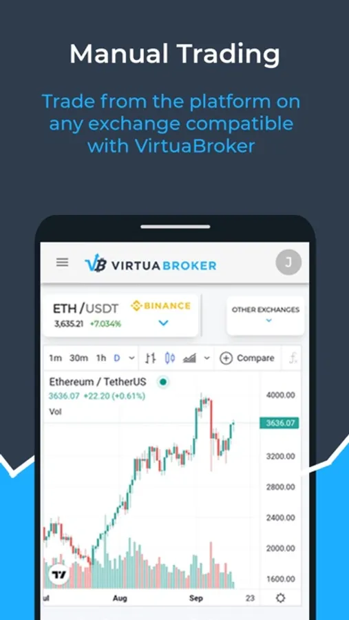 The VirtuaBroker app is an advanced all-in-one app that allows you to manage and trade crypto manually with AI-driven trading bots across all of your exchanges.