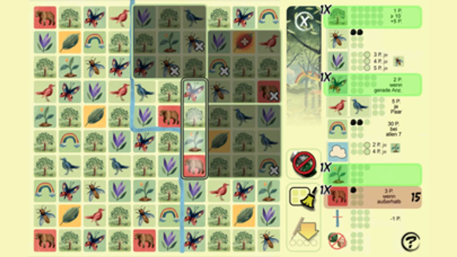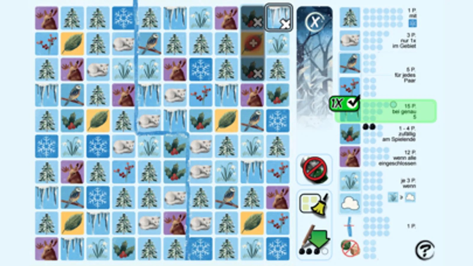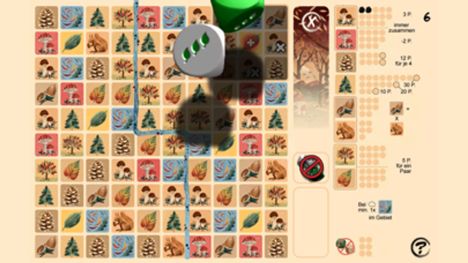 The game is very simple. 2 dice are thrown. The numbers on the dice determine the size of the fields to be marked. Now select a forest symbol to be included in the scoring and the next move is made. Thanks to the cleverly designed game plans and the matching scoring rules, this simple principle always results in new exciting decisions. Most of the time, you have the choice between safe points and a riskier variant, which allows you to score significantly more points, but only if there are still suitable rolls afterwards. Here you have to decide wisely!
