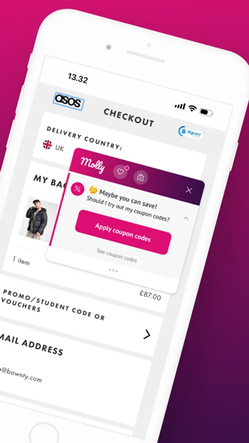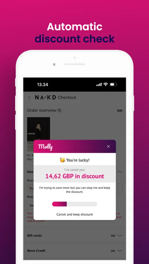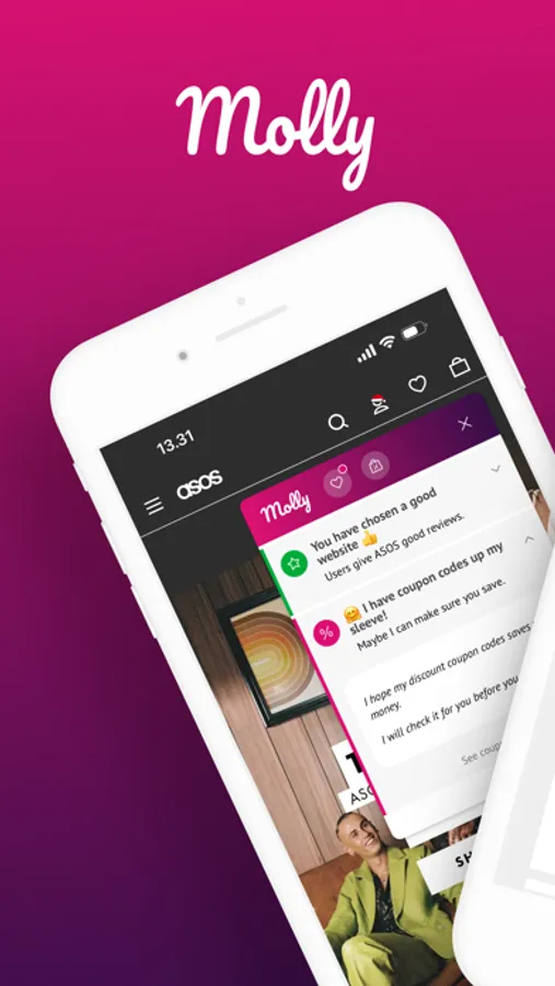 Have you noticed that almost all webshops have a discount code field? If you don't fill it in, you'll probably miss out on a discount on your purchase. Molly automatically finds and inserts coupon codes for you and keeps the one that gives you the biggest saving. So you don't have to spend time looking for dodgy codes yourself. Molly works in more than 7000 webshops, and we're adding new ones all the time.