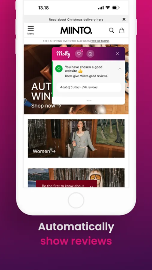 Have you also tried to place an order and too late see the bad ratings of the webshop? Molly automatically shows you reviews before you shop. With Molly installed, you can shop more confidently than before.