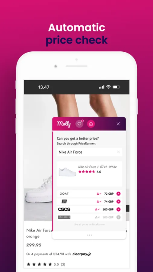Molly automatically price checks the product you are looking at. If you can save money on other webshops, you'll get direct links to the cheapest site.